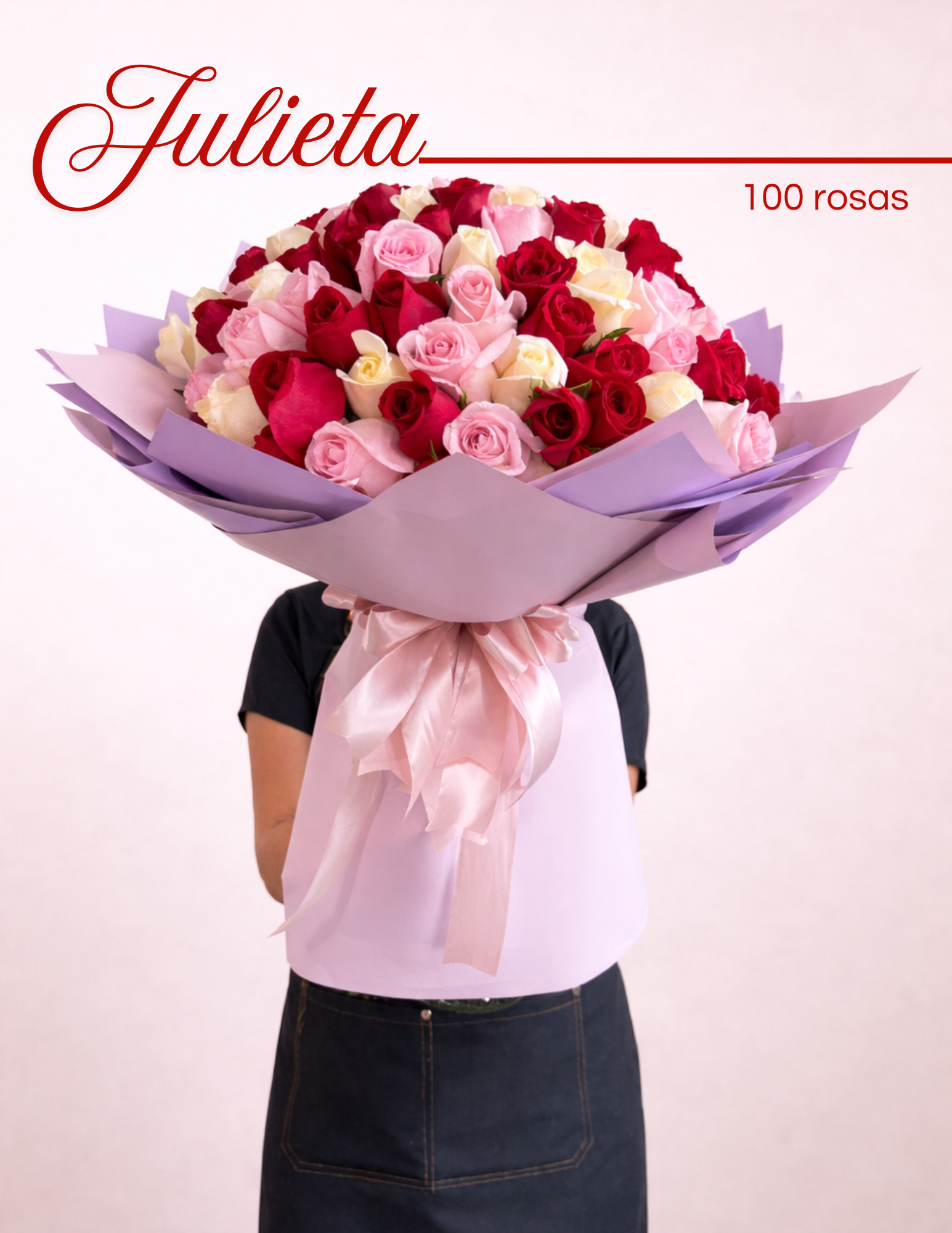 Julieta es la musa del amor tierno y apasionado. Un majestuoso ramo de 100 rosas, ideal para ese amor eterno.